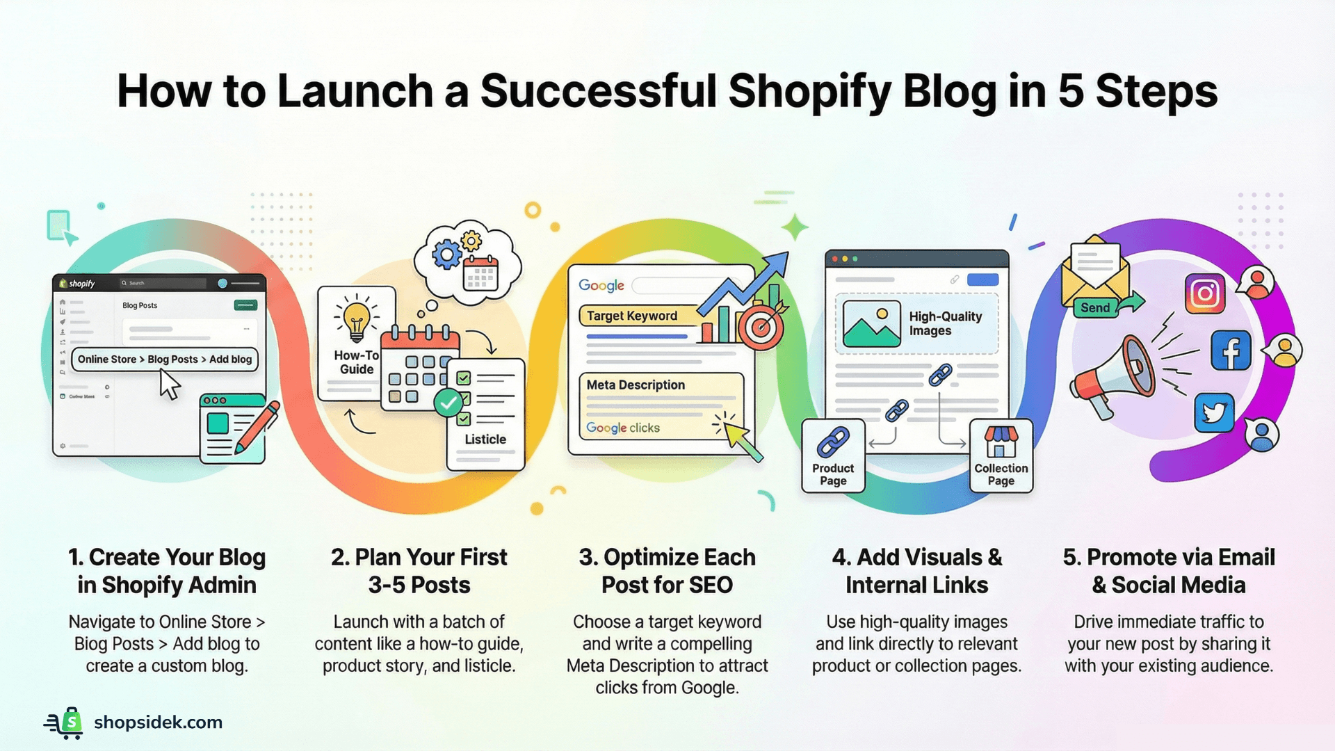 You have the inspiration and the templates. Now it’s time for action. Launching a blog on Shopify is simpler than you might think. Follow this straightforward five-step process to go from idea to your first published post.