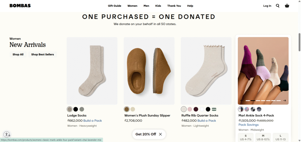 Like Tentree, Bombas built its brand on a social mission: “one pair purchased = one pair donated.” With over 100 million items donated to date, this simple, powerful message is the first thing you see on their site.
