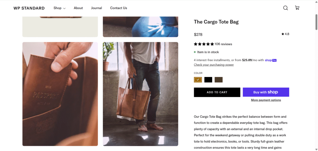 For a brand selling premium leather goods, communicating quality through a screen is the ultimate challenge. WP Standard meets this challenge with impeccable visual merchandising.