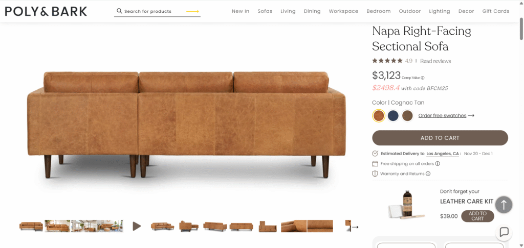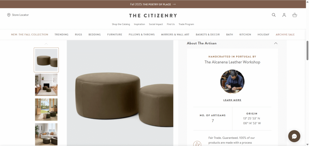 Their product pages are a masterclass in visual merchandising, using high-resolution images and videos to highlight the texture and detail of their unique materials.