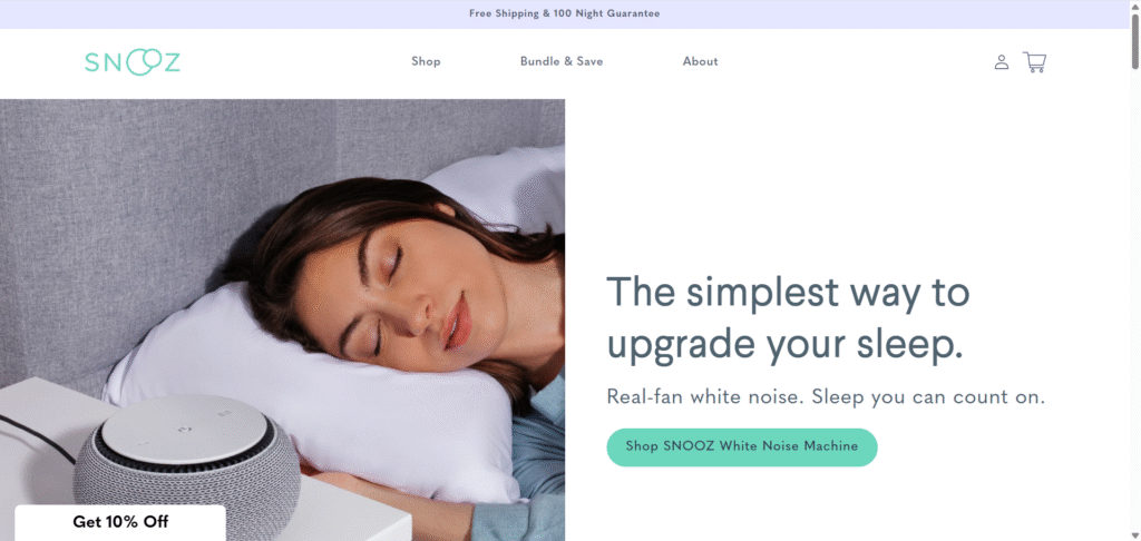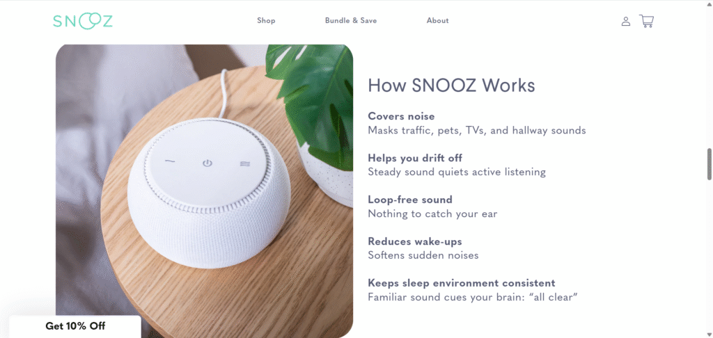 Snooz sells one thing: a white noise sound machine. Their entire homepage is a masterclass in conversion-focused design, acting as a single, long-form landing page. The user experience guides visitors on a linear journey from the problem (poor sleep) to the solution (their product).