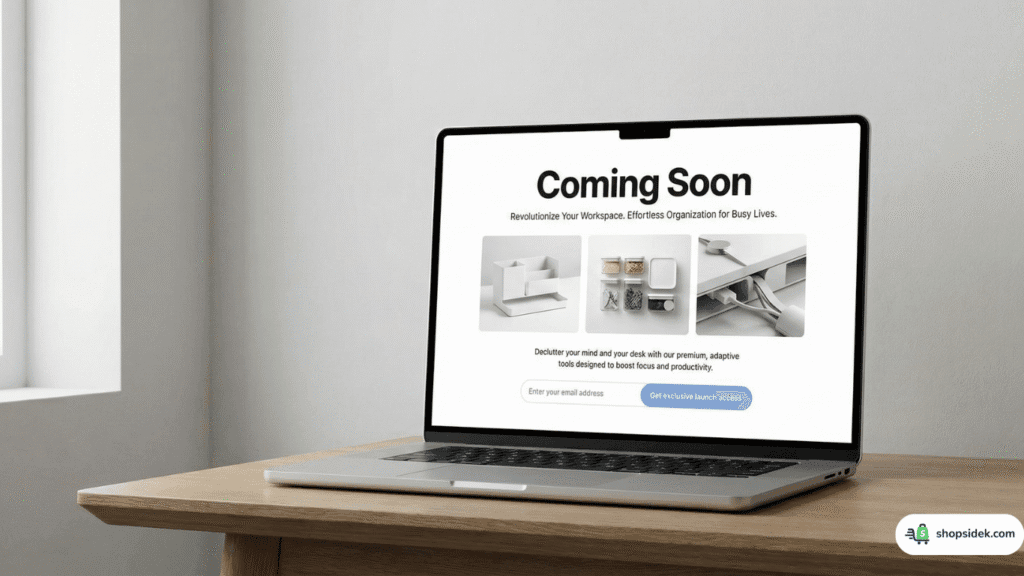 - A clear call-to-action with a simple email sign-up form (e.g., “Be the first to know when we launch” or “Get an exclusive launch day discount”).