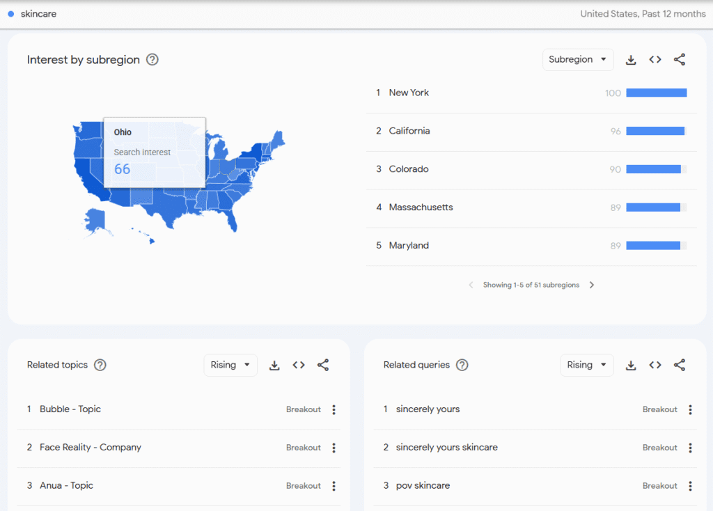 Start with Google Trends. If you have a category in mind, like “skin care,” you can see what related terms are gaining traction.