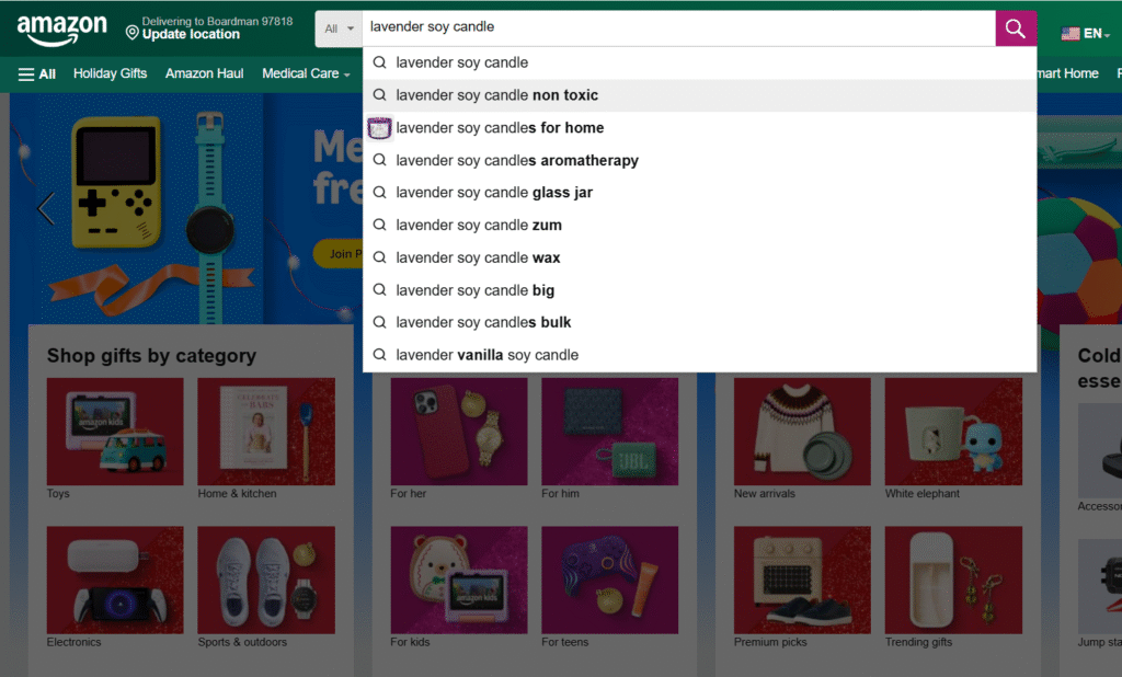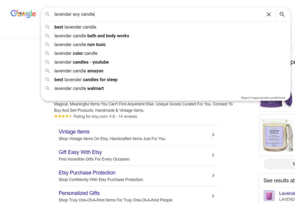 For The Cozy Corner, I typed “lavender soy candle” into both search bars and instantly got ideas like “best lavender candle,” “lavender candle bath and body works,” and “lavender candle nontoxic.”