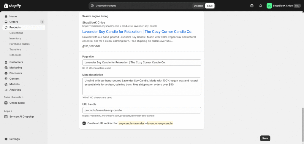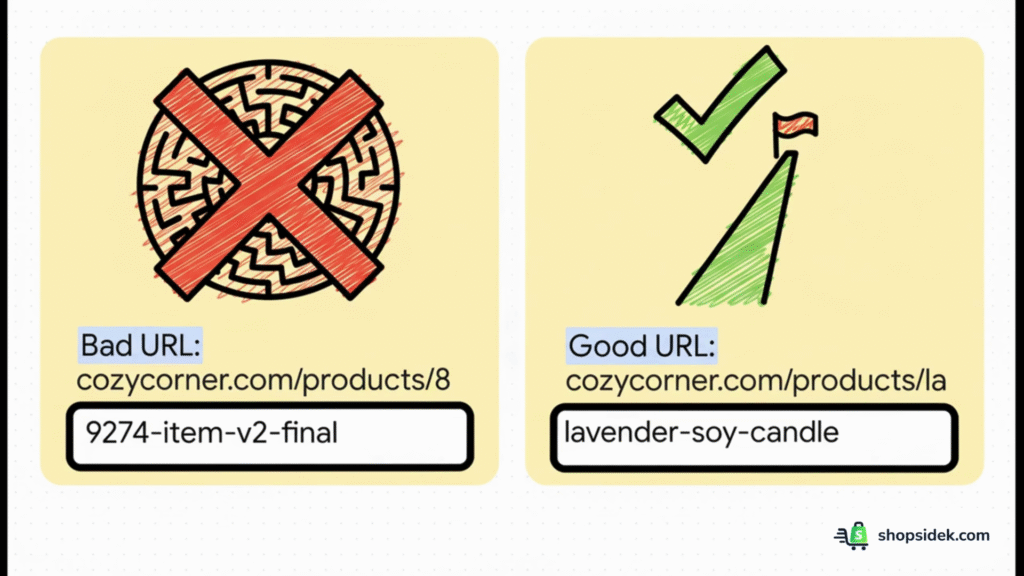 A clean URL helps users and search engines understand the page’s content at a glance. For The Cozy Corner’s best-selling candle, we made a simple change: