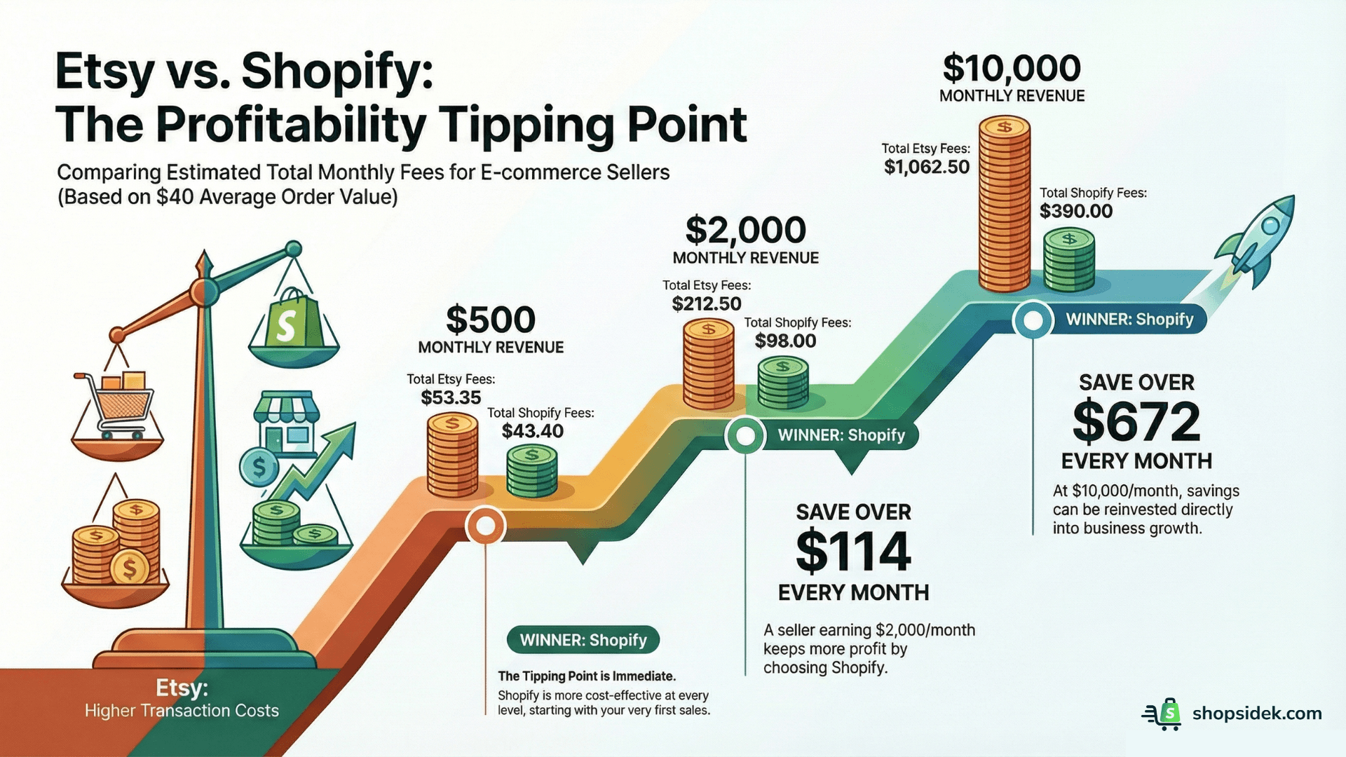 The data proves that Shopify is the more cost-effective choice at every level. While Etsy may seem cheaper for a seller with very few sales, Shopify’s scalable model quickly becomes more profitable: