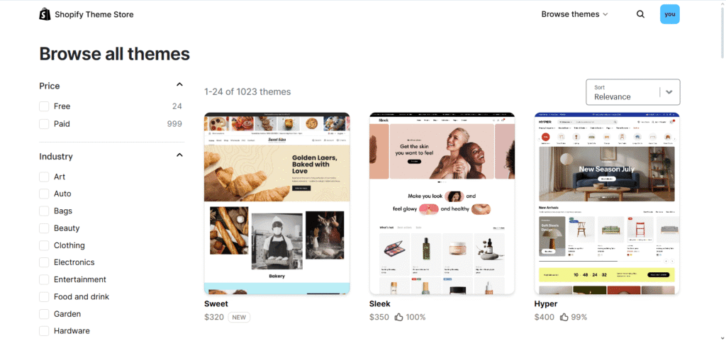 Shopify, in contrast, is built for brand expression. You start with a foundational theme, and according to recent data, you have a library of over 24 free and 1000+ paid themes to choose from.