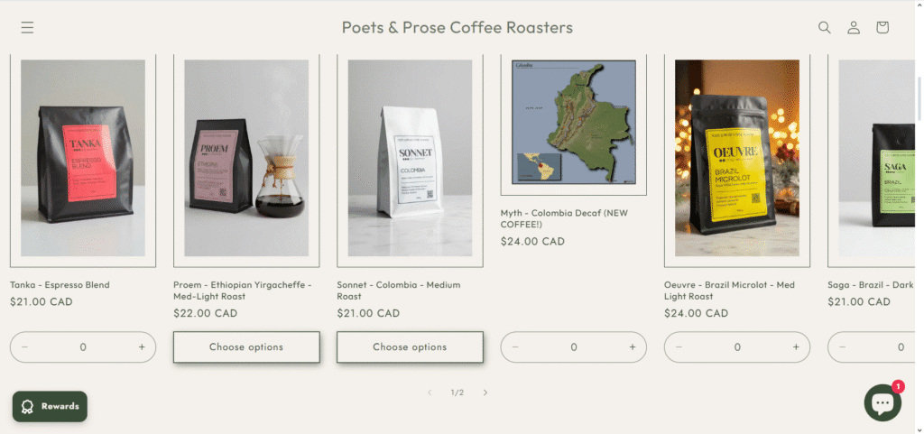 Live Store Examples: Poets & Prose uses the theme’s assertive typography and clean lines to organize a diverse range of coffee blends, proving that Refresh can turn a simple product catalog into a sophisticated, storytelling experience.