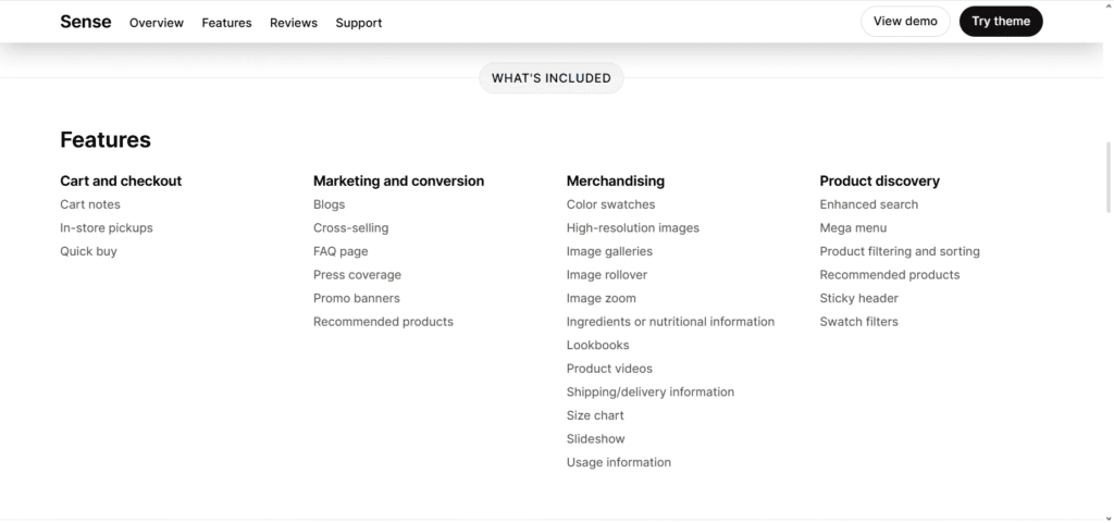 Make a short list of your absolute “must-have” features. Do you have a large product catalog that requires a “mega menu” for navigation? Do you need to highlight customer testimonials or video content? You can scroll down to explore the key features of each theme, and check the theme’s official feature list to make sure your must-have features are supported right from the start.