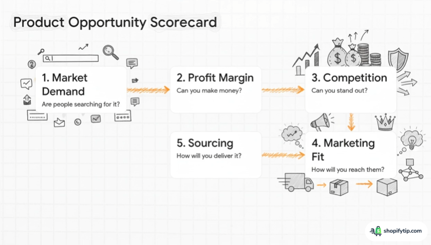 We’ve developed a 5-point evaluation framework – the Product Opportunity Scorecard – to help you analyze potential products like a seasoned pro and confidently decide what to sell on Shopify.