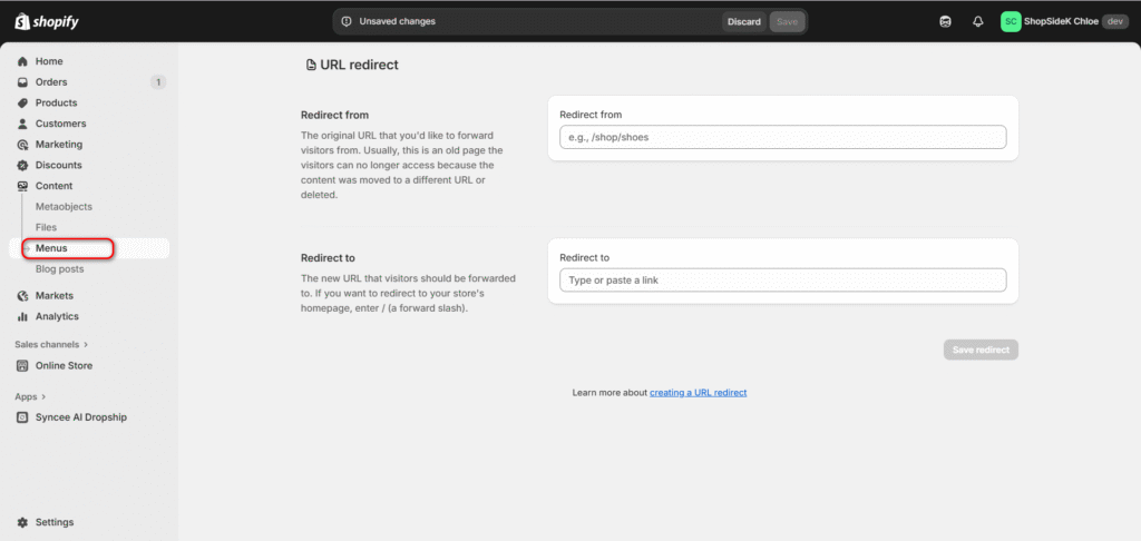 Using the URL list you created in the pre-migration blueprint, go to Content → Menus → URL Redirects in Shopify and create a redirect for every important old link to its new Shopify equivalent.