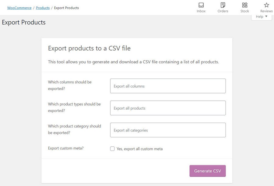 You’ll be given options to select which columns and product types to export. For a complete transfer, it’s best to leave all columns and product types selected. Download the generated CSV file.